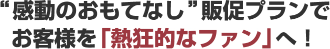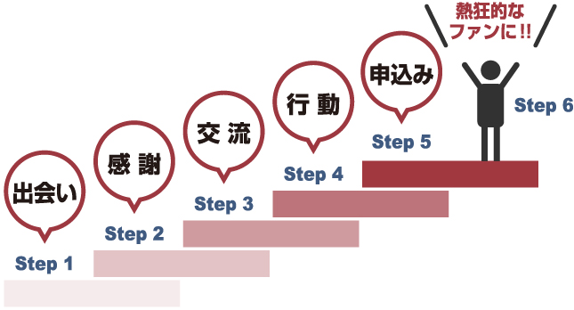 あなたの商品やサービスを説得ではなく納得して購入申込みを頂くことが大原則。ここからお客様から熱狂的なファンへ導く"真の感動のおもてなし"が始まります。商品・サービスの提供が終わりではなく始まりです。お客様を感動させ、リピートや口コミ・ご紹介へ導くことが会社を成功へ導く鍵となります。口コミは、新聞や雑誌・テレビCMにも負けない"最高の媒体"です。